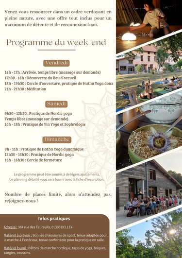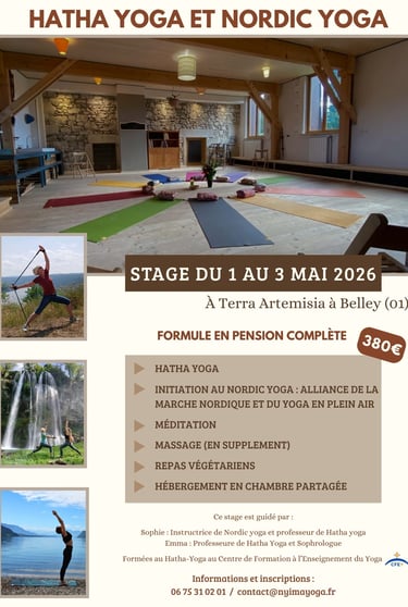 Sophie vous accompagne en nordic yoga, le yoga de la marche en pleine nature. Chaque pas devient un espace d’exploration : appuis, souffle, rythme, coordination. La respiration guide nos pas et notre flow de postures avec les bâtons. Les sens s’éveillent. Le mouvement se déploie dans l’écoute du corps, en lien avec l’environnement, pour affiner les sensations, élargir la présence au vivant et habiter pleinement l’instant présent.